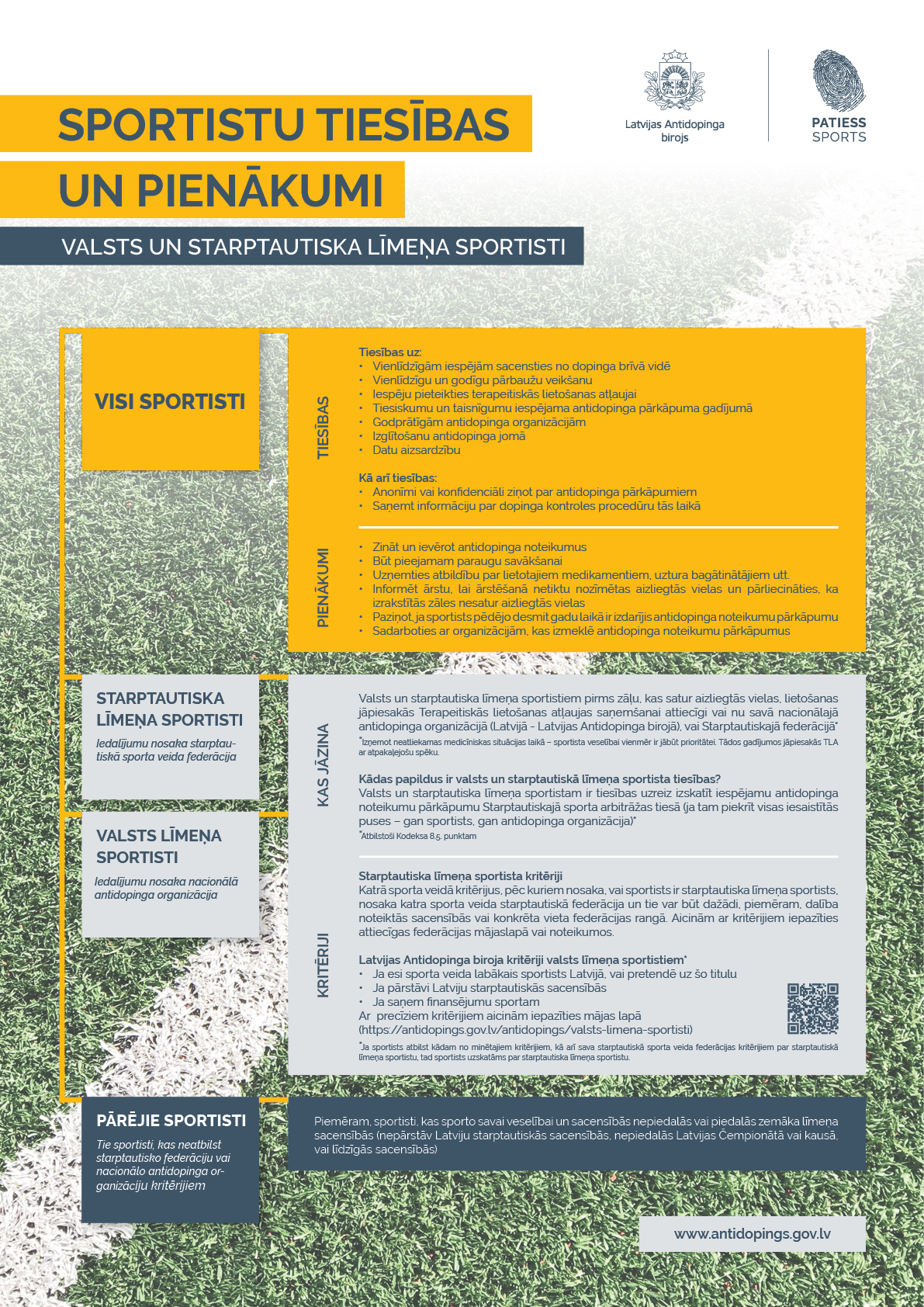 Atbilstoši Pasaules Antidopinga kodeksam un Starptautiskajam pārbaužu un izmeklējumu standartam, sportistus klasificē starptautiska un valsts līmeņa sportistos.